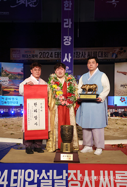 žȼ³³¯Àå»ç¾¾¸§´ëȸ¡¯ ÇѶóÀå»ç(105kgÀÌÇÏ)¿¡ µî±ØÇÑ ±èº¸°æ(¹®°æ½Ãû)ÀÌ ±è¼±°ï °¨µ¶(¿ÞÂÊ), ½Å±¤È£ ÄÚÄ¡(¿À¸¥ÂÊ)¿Í ±â³ä»çÁøÀ» Âï°í ÀÖ´Ù.