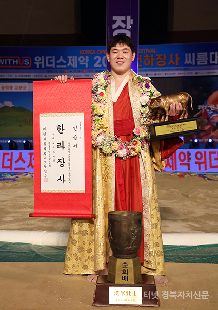 õÇÏÀå»ç ¾¾¸§´ëÃàÁ¦' ÇѶóÀå»ç(105kg ÀÌÇÏ)¿¡ µî±ØÇÑ ÃÖ¼ºÈ¯(¿µ¾Ï±º¹Î¼Ó¾¾¸§´Ü)ÀÌ È²¼ÒÆ®·ÎÇǸ¦ µé°í ±â³ä»çÁøÀ» Âï°í ÀÖ´Ù.
