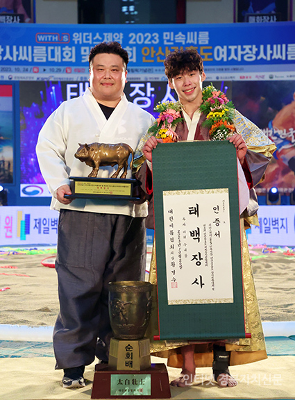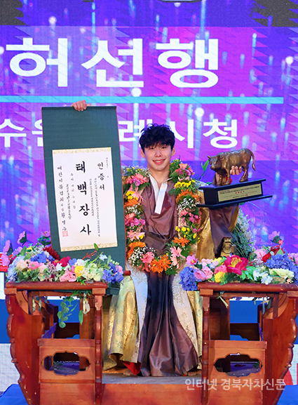 2¹Î¼Ó¾¾¸§ ¾È»ê±èÈ«µµÀå»ç¾¾¸§´ëȸ¡¯ ŹéÀå»ç(80kgÀÌÇÏ)¿¡ µî±ØÇÑ Çã¼±Çà(¼ö¿øÆ¯·Ê½Ãû)ÀÌ ÀÌÃæ¿± °¨µ¶(¿ÞÂÊ)°ú ±â³ä»çÁøÀ» Âï°í ÀÖ´Ù.