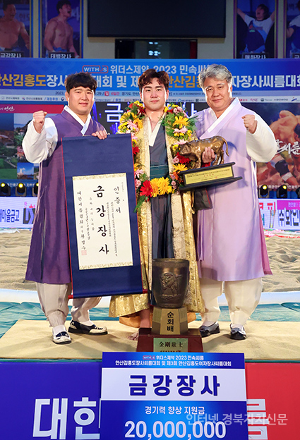2 ¹Î¼Ó¾¾¸§ ¾È»ê±èÈ«µµÀå»ç¾¾¸§´ëȸ¡¯ ±Ý°Àå»ç(90kgÀÌÇÏ)¿¡ µî±ØÇÑ Á¤Á¾Áø(¿ïÁÖ±ºÃ»)ÀÌ ÀÌ´ëÁø °¨µ¶(¿À¸¥ÂÊ), ÀÌÁøÇü ÄÚÄ¡(¿ÞÂÊ)¿Í »çÁøÀ» Âï°í ÀÖ´Ù.